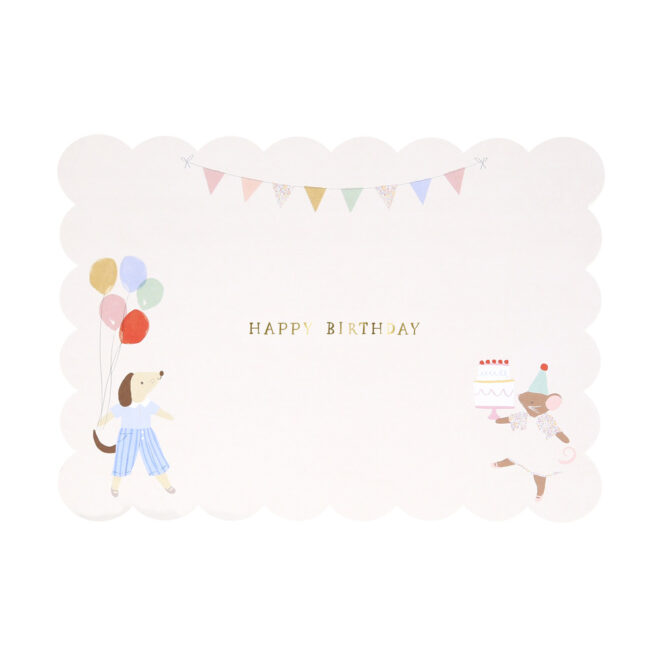 Adorable animal alert! This birthday card is the perfect way to send your best wishes for early years and first birthdays. Inspired by vintage fashion illustrations and colour palettes, with shiny metallic gold threads and pops of red to keep the look current. This concertina card opens out to reveal happy animals with balloons on parade, ideal to decorate a window sill, table or mantel, to fill the room with joy.