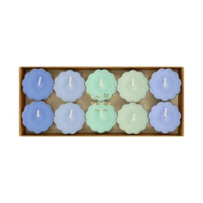 Forget white candles, light up your life with color. This tea light candle set is not only several shades of beautiful blues and greens, but the scalloped shape gives a stylish effect, too. A fabulous host gift or ideal to decorate any room or party.