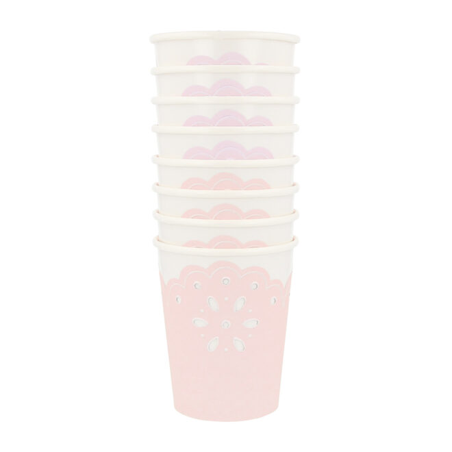 This pretty party range is inspired by broderie anglaise, a delicate lace design that's back in style. These pink and peach cups, teamed with soft pink and peach embossing and shiny white foil, will make your party drinks look effortlessly chic. They're perfect for bridal showers or any celebration where you want an elegant and refined look.