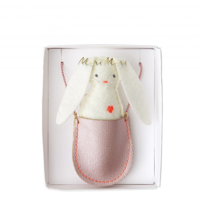 This adorable necklace is perfect as a delightful Easter, or Springtime, gift. Featuring a cute padded felt bunny sweetly sitting in a glittery pink pocket. Hung with a pretty pink enamel bead chain.