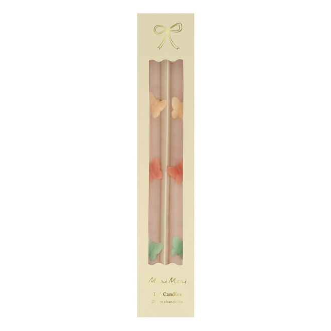 - Ivory candles with hand-painted wax butterfly design in yellow, red and green