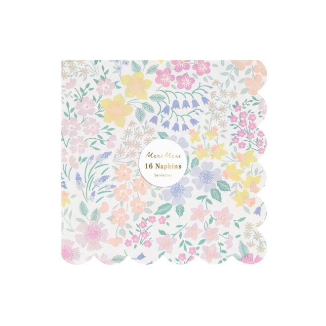 Welcome to our fantastic flower range! This pretty ditsy design is reminiscent of a cottage garden, with a field of floral wonder. Take your time to spot your favorites daffodils, bluebells, daisies and many more and instantly feel the joys of spring. These scalloped large napkins are the perfect tableware for a garden party, picnic, baby shower or bridal shower.