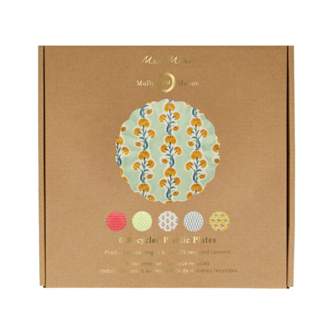 We've collaborated with esteemed British printmaker Molly Mahon, using her patterns to create a beautiful bohemian party collection. This set of reusable recycled plastic small plates will add style to any party.