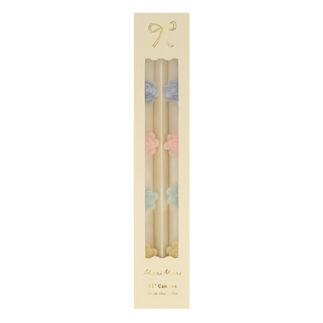 • Ivory candles with hand-painted wax flower relief design in blue, pink, green and yellow colors.