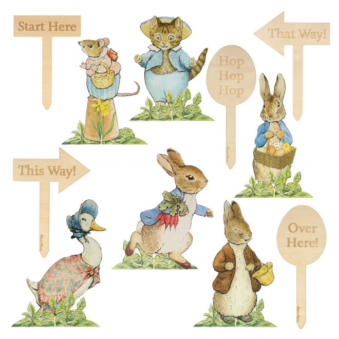 Peter Rabbit and his charming friends are perfect to lead little ones on a very special Easter egg hunt. This set features 6 character cards, including Peter, Benjamin Bunny, Jemima Puddleduck, Tom Kitten and Mrs.Tittlemouse. It also includes 6 etched wooden stakes with fun phrases to guide them to the candy treasures. 'Start Here', 'This Way', 'That Way', 'Hop Hop Hop' and 'Over Here' will really make the children smile!
