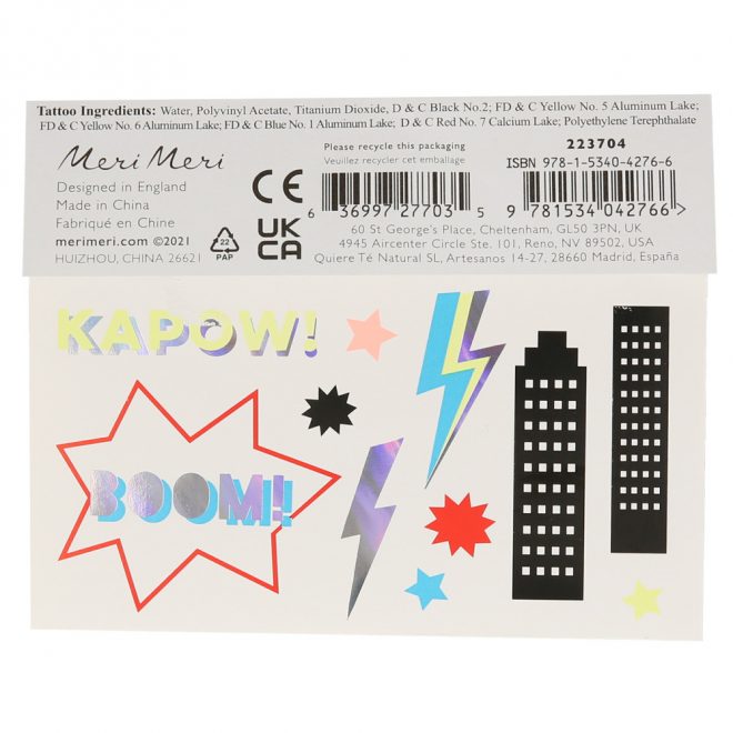 Look and feel like a superhero with these fabulous temporary tattoos. They feature fabulous illustrations with bright neon colors and shiny silver foil.