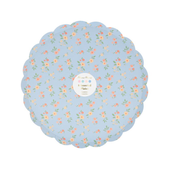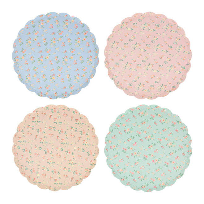 Ditsy floral clusters add effortless elegance to any setting. This classic design is influenced by floral pattern trends, with a scallorded border for a stylish look. The four different vintage color ways, of pink, peach, mint and blue, in this paper plate set are perfect for afternoon tea, garden parties, bridal showers or baby showers.